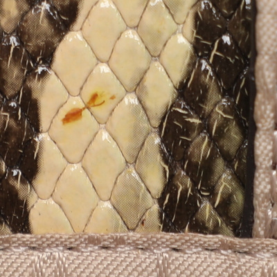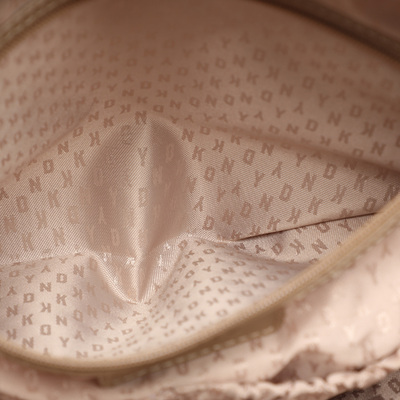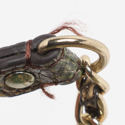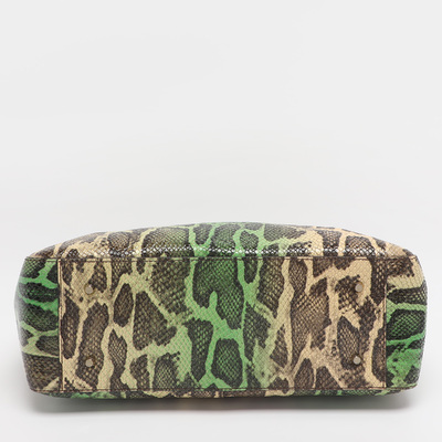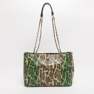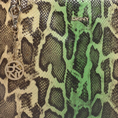 This DKNY tote features python embossed leather in green and beige, paired with chain handles and a dangling logo. Spacious and eye catching, it makes an effortless statement for daily wear.