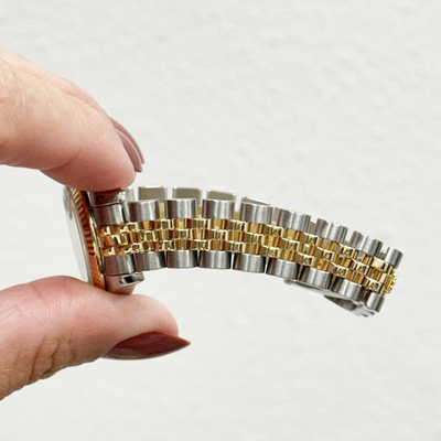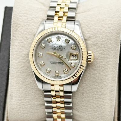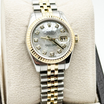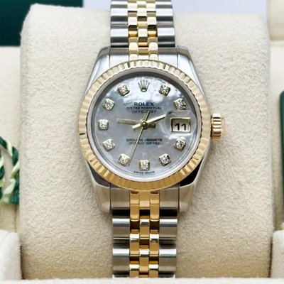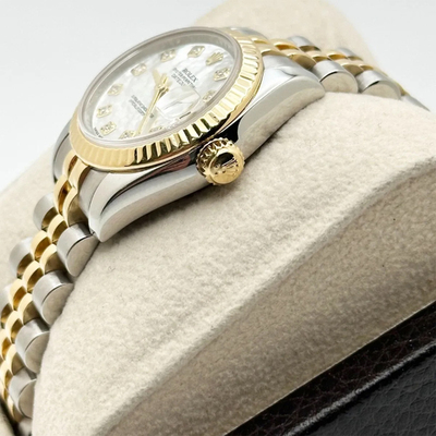 The Rolex President Datejust 179173 exudes timeless sophistication, featuring a 26 mm case in 18k yellow gold and stainless steel. Its mother of pearl dial, accented with diamond hour markers, offers subtle radiance, while the automatic movement ensures precision and reliability. A true embodiment of Rolex’s enduring elegance.