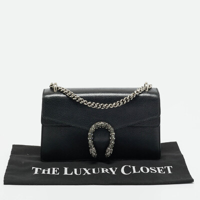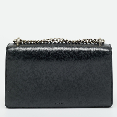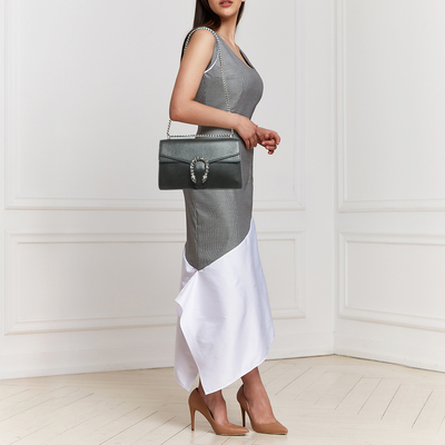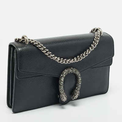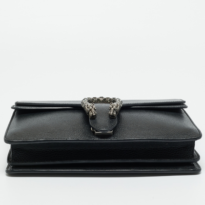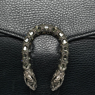 Gucci elevates its iconic Dionysus designed with black leather. Defined by its distinctive crystal embellished tiger head closure, this small shoulder bag is a perfect blend of dramatic allure and timeless sophistication.
