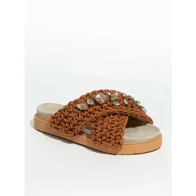 Стильные шлепанцы INUIKII коричневого цвета на удобной эргономичной замшевой подошве, декорированы объемным плетением из хлопковой веревки и стразами. Эти шлепанцы отлично походят для длительных прогулок.