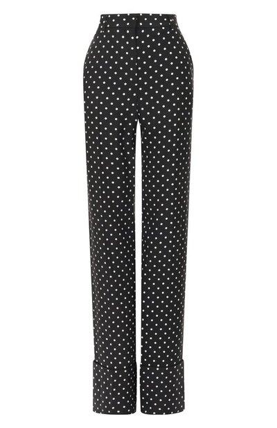 Брюки с проглаженными стрелками выполнили из текстурной вискозы с паттерном Supergran Plusdepois. Модель с четырьмя карманами дополнили широкими отворотами.