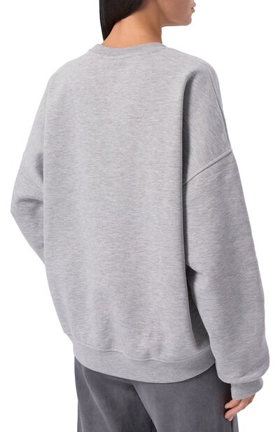 Oversize-свитшот с рифлеными манжетами и поясом выполнили из хлопкового трикотажа, усиленного полиэстером. Роль декора отдали вышитому логотипу на канте круглой горловины.