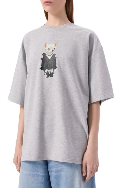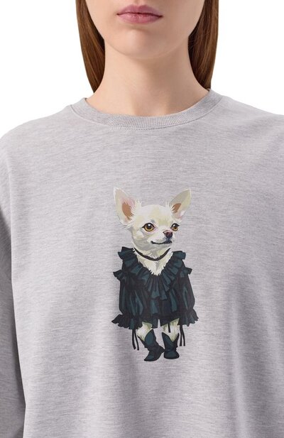 В коллекцию Doggy вошла футболка с изображением чихуахуа в фирменных блузе, шортах и сапогах. Модель с круглой горловиной в рубчик выполнили из хлопкового трикотажа.