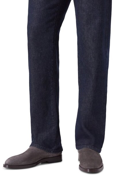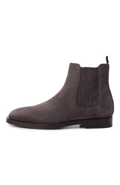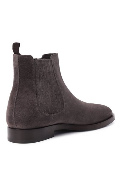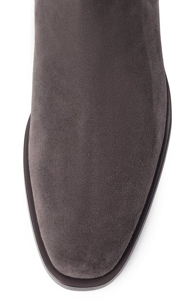 Челси на наборном каблуке изготовили из тонко выделанной замши. Модель с петлей на голенище украсили декоративным стежком в тон сбоку.