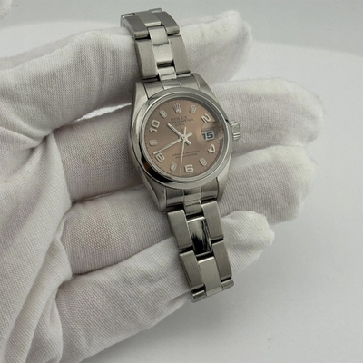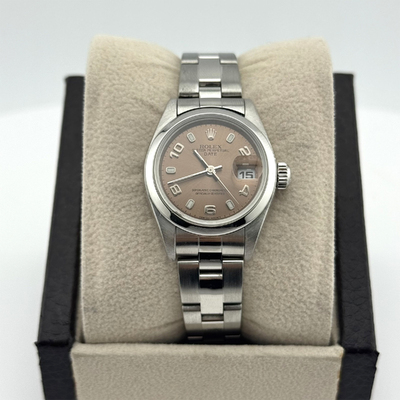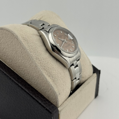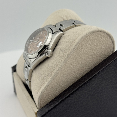 Charming and feminine, this 26 mm Rolex Datejust 79160 highlights a rare pink salmon dial within a sleek stainless steel case. A perfect blend of playful color and timeless craftsmanship.