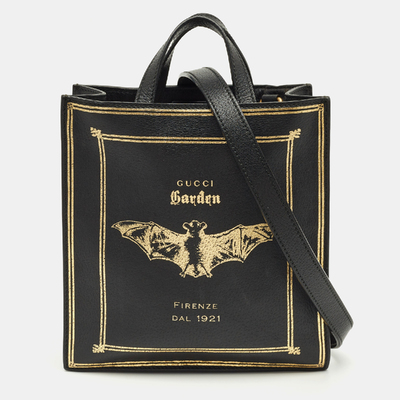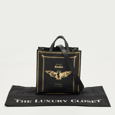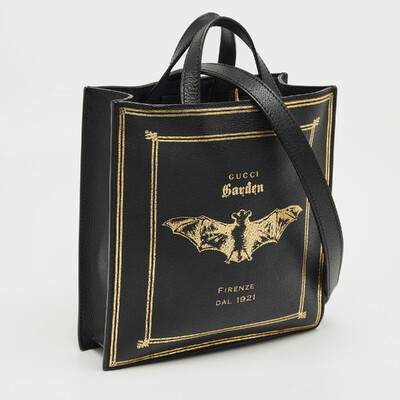 The Gucci Garden Bat Vertical Tote in black leather carries a bold presence. A golden bat perches across the textured surface, hinting at mystery and unexpected charm. Its vertical frame holds essentials with ease, while the design itself reflects Gucci’s daring creativity and imagination.