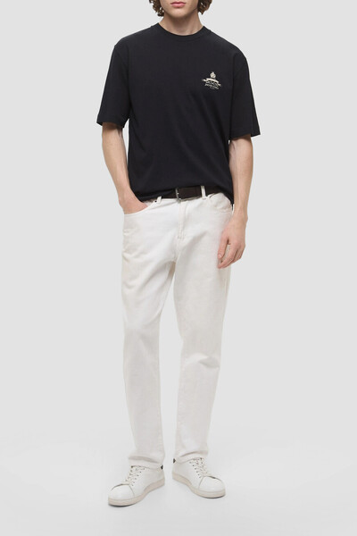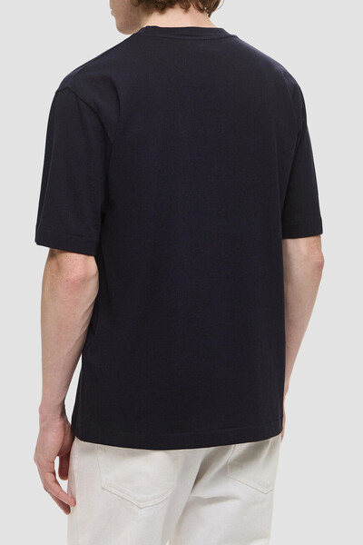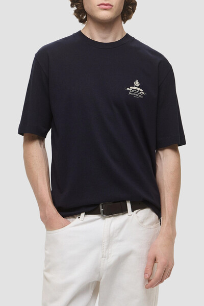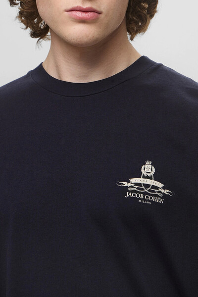 Футболка JACOB COHЁN станет идеальным дополнением повседневного гардероба мужчины. Изделие прямого силуэта выполнено из мягкого хлопкового трикотажа тёмно-синего цвета. Принадлежность модели Дому обозначена крупным состаренным принтом с логотипом и знаковой символикой, размещённым слева на груди.