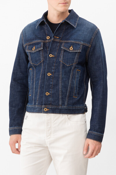 Синяя куртка JACOB COHЁN с четырьмя карманами. Для пошива повседневной модели используется мягкий хлопковый деним стрейч с эффектом делаве. Характерными особенностями изделия прямого силуэта являются оранжевая прострочка на швах и наличие знакового для бренда декора: светло-коричневой текстильной нашивки с вышитым логотипом на плотном поясе сзади. Манжета снизу регулируется патами на металлических пуговицах.