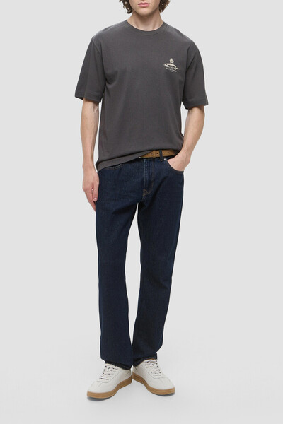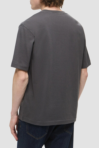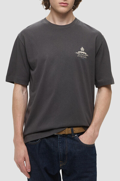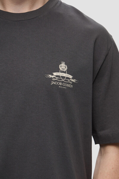 Футболка прямого силуэта от бренда JACOB COHЁN. Для создания повседневной модели используется мягкий хлопковый трикотаж тёмно-серого цвета. В роли культового декора выступает крупный состаренный принт с логотипом и символикой слева на груди. Круглый вырез горловины оформлен резинкой для удобства в носке.
