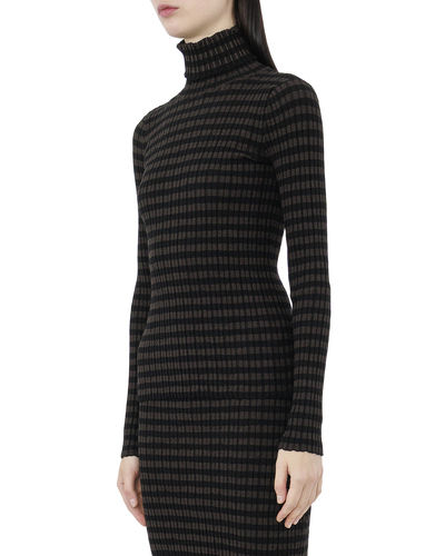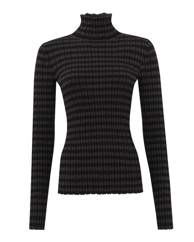 Эта водолазка представляет собой идеальное воплощение сдержанной элегантности с современным изяществом. Выполненная из эластичного материала, она обеспечивает комфортное прилегание, подчеркивая изящные линии фигуры. Горловина выполнена в классическом стиле стойки, придавая образу утонченность и изысканность. Мягкий, но плотный воротник защищает от прохлады, сохраняя тепло и добавляя уют. Узор из тонких полос создает визуальную глубину, привнося динамичный элемент в традиционный дизайн. Цветовое сочетание теплых кофейных и черных оттенков формирует богатую, но сдержанную палитру, идеально подходящую для любого времени года. Особое внимание привлекает отделка края водолазки и манжет. Легкая волнистая структура добавляет нежную текстурную деталь, подчеркнув оригинальный стиль без излишней броскости. Эта водолазка легко станет ключевым элементом в гардеробе, подходя как для официальных, так и для повседневных образов. Она подчеркнет утонченный вкус и стиль своей обладательницы, добавляя нотку современного шика в любой наряд.