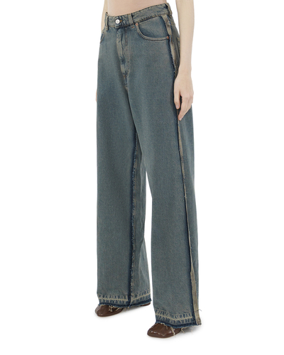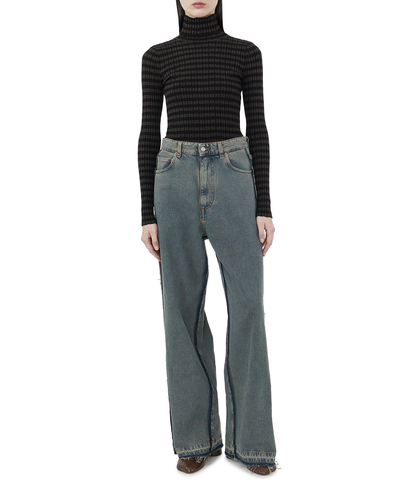 Эти джинсы — воплощение непринужденного стиля и современного комфорта с акцентом на актуальные модные тенденции. Выполненные из плотного денима, они сочетают в себе надежность и эстетическую привлекательность. Фасон с завышенной талией подчеркивает линию бедер и обеспечивает визуальное удлинение ног, создавая гармоничный и женственный силуэт. Широкие брючины придают образу свободную и расслабленную динамику, оставаясь при этом неизменно актуальными. Естественная потертость и светлый синий оттенок добавляют джинсам винтажную привлекательность. Особое внимание привлекает необработанный край, создающий эффект едва заметной небрежности, что подчеркивает индивидуальность и стиль своего обладателя. Классические пять карманов и контрастная строчка выполняют не только функциональную роль, но и добавляют традиционные детали, остающиеся вне времени. Эти джинсы станут универсальной частью гардероба, идеально комбинируясь с различными элементами одежды — от элегантных блузок до простых футболок. Они не только подчеркивают актуальность, но и создают ощущение комфорта и свободы в движении.