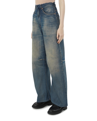 Эти джинсы — икона стиля, объединяющая винтажное очарование и современный подход к комфорту. Они изготовлены из качественного, плотного денима, который обеспечивает долговечность и практичность в ежедневной носке. Широкий крой и высокая талия формируют расслабленный силуэт, подчеркивая актуальные модные тенденции. Такая форма создает эффект длины и элегантности, оставаясь при этом крайне комфортной и функциональной. Потертости на бедрах и коленях вносят ноту изысканной небрежности, добавляя джинсам характер и динамику. Этот элемент прекрасно сочетается с различной обувью, от каблуков до кроссовок, делая их универсальными для любого случая. Особый акцент на необработанном крае дополняет образ дерзостью и свободой, создавая модный эффект естественности. Даймонд-строчка и классические пять карманов сохраняют традиции, обеспечивая практичное использование. Эти джинсы идеально вписываются в гардероб современной модницы, сочетая в себе нотки ретро и минимализм, делая каждый образ уникальным и стильным.