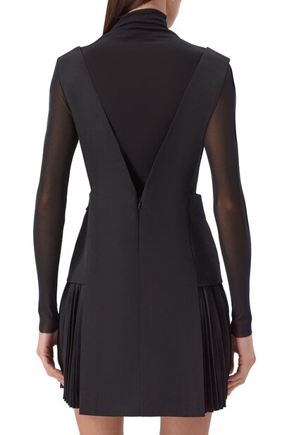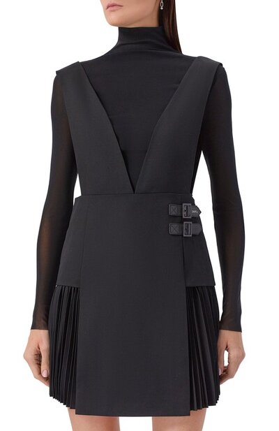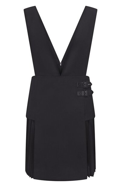 Мини-платье с глубокими V-образными вырезами выполнили из шерсти. Талию дополнили двумя ремешками, на один из которых нанесли логотип марки. Модель с плиссированными вставками на подоле застегивается потайной молнией сзади.