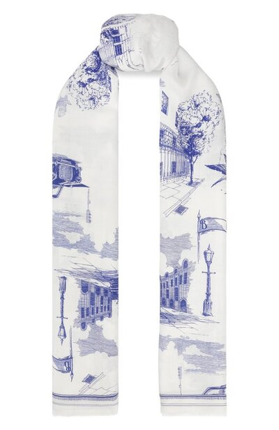 Палантин из микса шелка и шерсти украсили принтом London landmarks. Края с короткой бахромой подчеркнули брендированными полосами.
