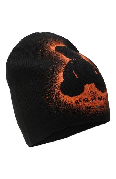 Шапку бини эластичной вязки украсили изображением Spray Bear, логотипом марки и надписью Bear in Mind. Аксессуар выполнили из микса шерсти и акрила.