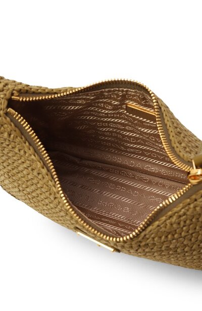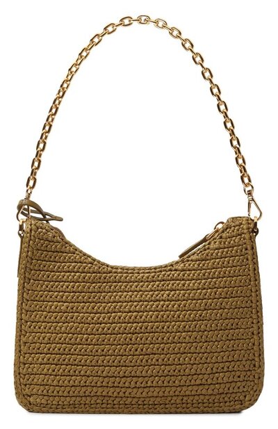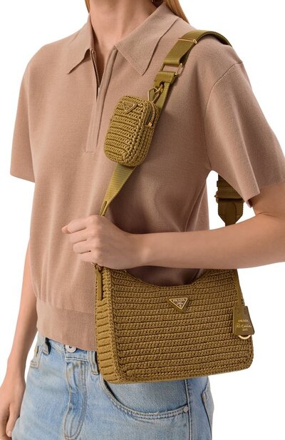 Сумку Re-Edition с фирменным эмалевым треугольником связали из рафии. Аксессуар со съемными короткой ручкой-цепочкой и плечевым ремнем дополнили монетницей и брелоком с металлическим кольцом.
