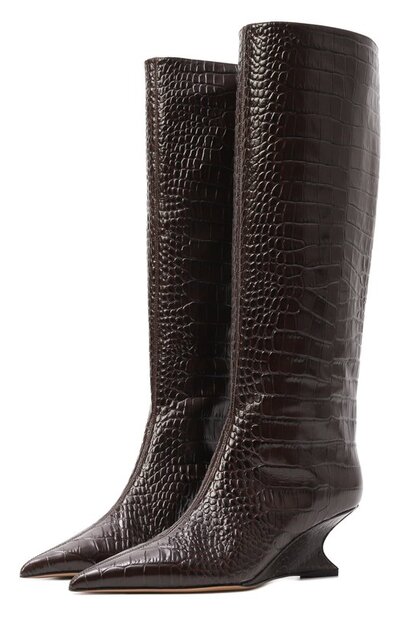 Сапоги Nina с зауженным мысом выполнили из кожи с тисненым узором под крокодила, обтянув этим материалом и изогнутую танкетку. Модель с высоким прямым голенищем не нуждается в застежке.