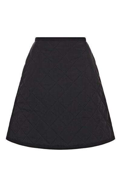 Юбку-трапецию со стеганым геометрическим узором сшили из вискозы. Модель с узким поясом застегивается потайной боковой молнией.