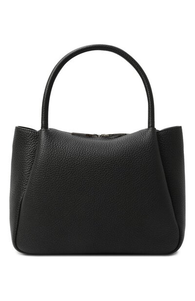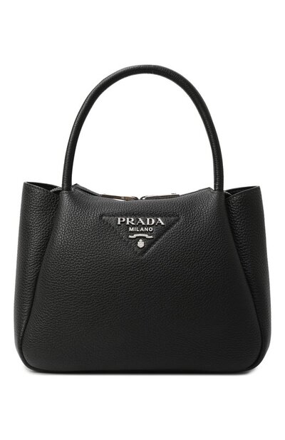 Сумку с двумя короткими ручками и съемным плечевым ремнем из брендированной ленты грогрен выполнили из зернистой телячьей кожи. Спереди аксессуар с тремя отделениями украсили простроченным треугольником с логотипом марки. Модель застегивается встречной молнией.