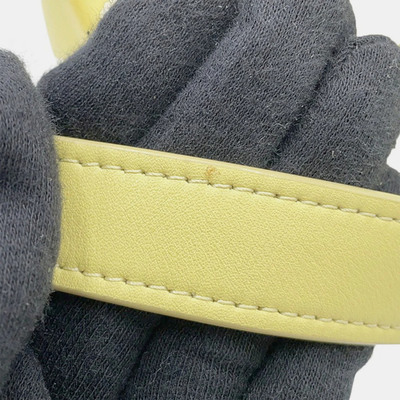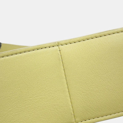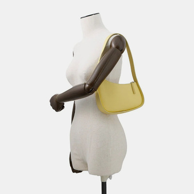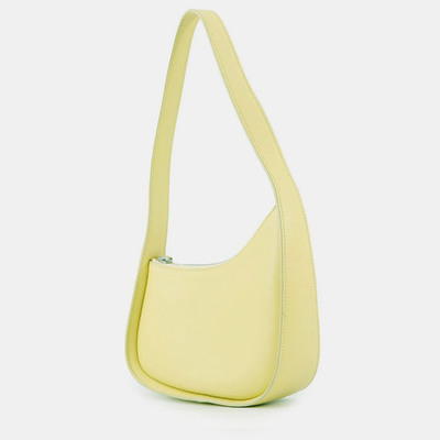 This shoulder bag from The Row features a curved half moon shape in a soft yellow leather. Minimal hardware and clean lines make it a practical piece for low key outfits.