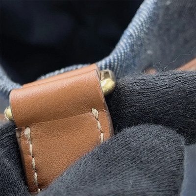 A casual mix of texture and tone, this MIU MIU bucket bag pairs dark navy denim with brown leather trim. Designed with a drawstring closure and compact shape, it’s ideal for daily carry with a laid back edge.
