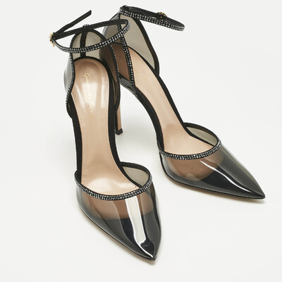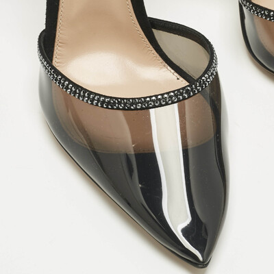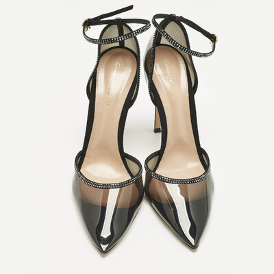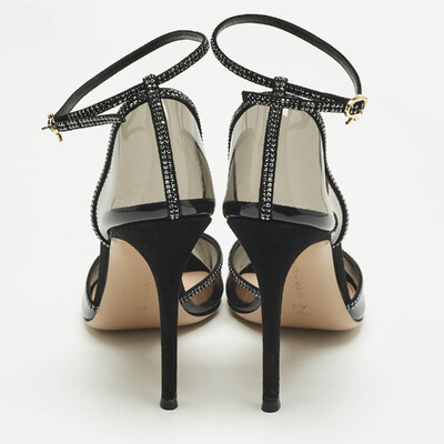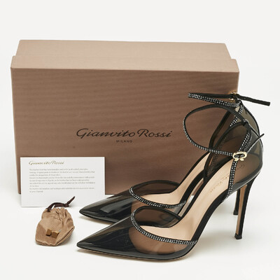 Gianvito Rossi’s Sabin sandals balance black PVC clarity with the sparkle of crystals. The open design keeps the focus on light and line, lifted by a fine heel. Wear them with a slip dress or tailored suit when the night asks for a touch of shimmer without excess.