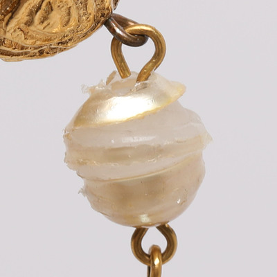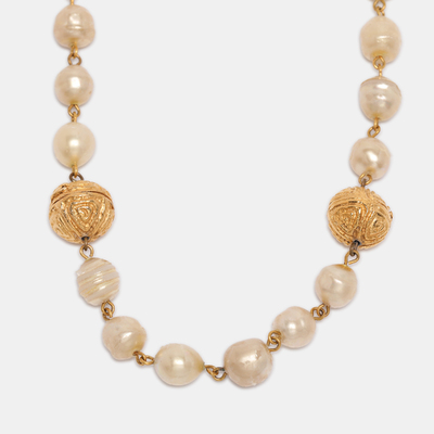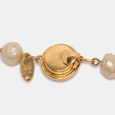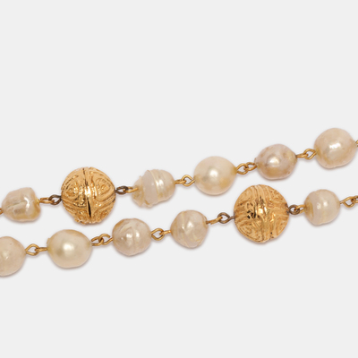 Chanel’s station necklace strings white faux pearls along a gold tone chain punctuated by CC logo accents. The combination captures the maison’s timeless aesthetic of elegance and ease. Layer it with shorter chains or wear it solo to bring instant polish to any outfit.