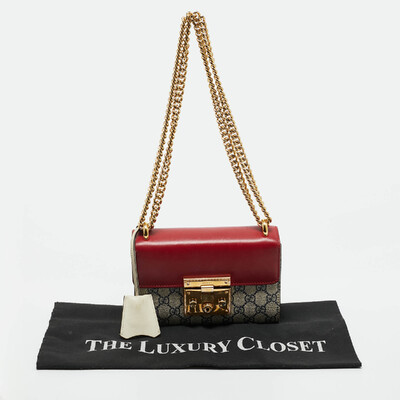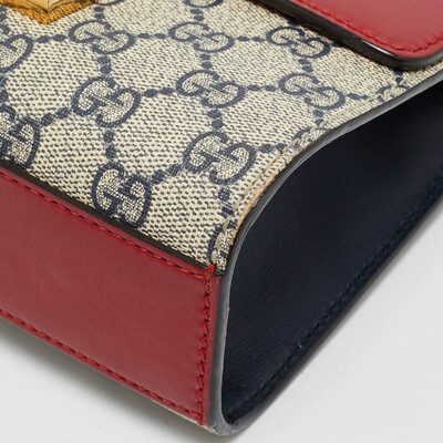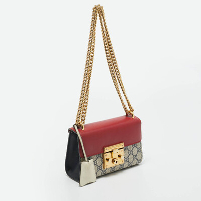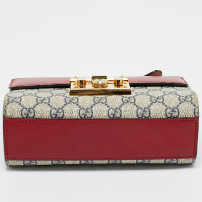 The Padlock bag reinterprets Gucci’s heritage codes with playful precision. Set in red and beige GG Supreme canvas with leather trim, it features a structured silhouette fastened by the house’s signature lock closure — a statement that bridges vintage nostalgia and bold, contemporary spirit.