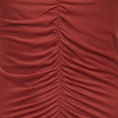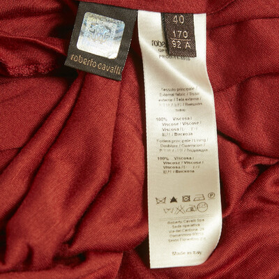 Roberto Cavalli’s long sleeve top in red ruched jersey hugs the frame with bold colour and texture. The gathered detailing flatters while adding depth to a simple cut. Pair with tailored trousers or leather for a confident, statement making look.
