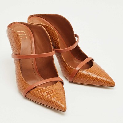 The signature Maureen mules are reimagined in croc embossed brown leather by Malone Souliers. Featuring the iconic curved silhouette and double straps, they balance sophistication with modern design. A versatile day to night pair.