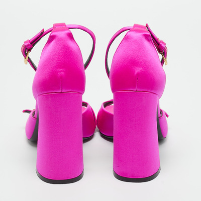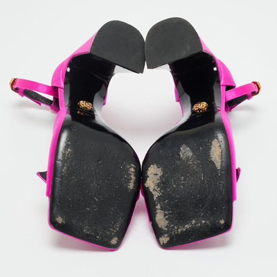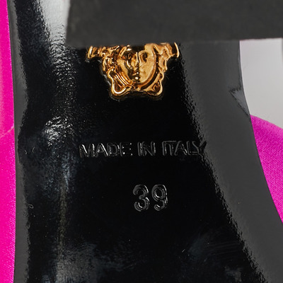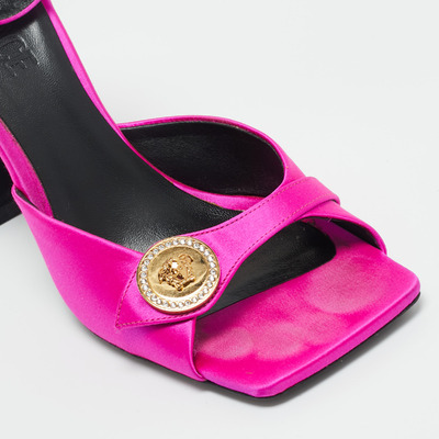 These Versace sandals radiate femininity in glossy pink satin, topped with the signature Medusa emblem for a regal touch. The sturdy block heel balances elegance with comfort. A statement piece for those who love playful yet powerful styling.
