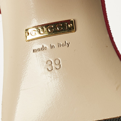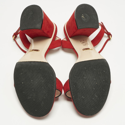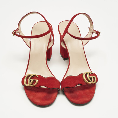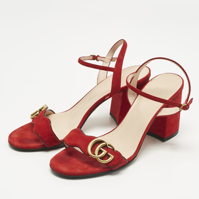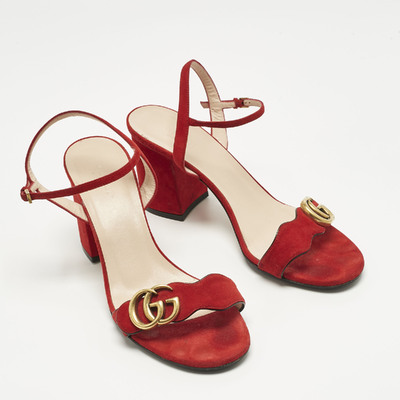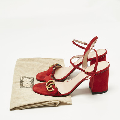 Gucci’s ankle strap sandals are crafted in rich red suede with signature gold tone GG detail. The elegant straps provide a secure fit while enhancing the luxe aesthetic. Perfect for both formal occasions and stylish evening events.