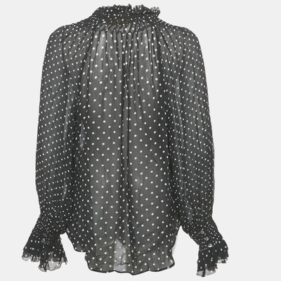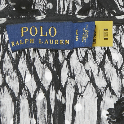 Lightweight georgette shapes this Polo Ralph Lauren blouse, with black polka dots floating across a sheer canvas. A relaxed cut and flowing sleeves lend the blouse an elegant presence.