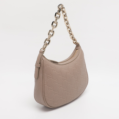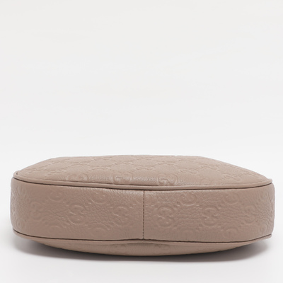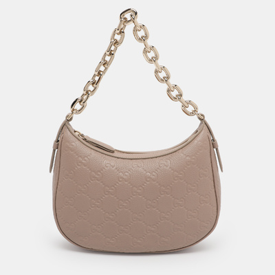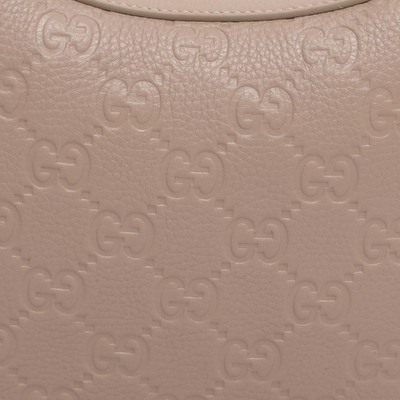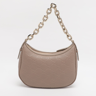 Gucci’s medium shoulder bag in beige Guccissima leather showcases the brand’s embossed signature pattern topped with a gleaming GG emblem. The supple leather, structured silhouette and discreet detailing make it a timeless city companion. Carry it against neutral tailoring or with fluid dresses to underscore its quiet luxury.