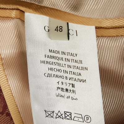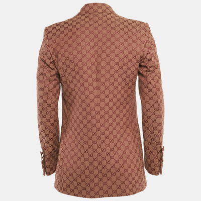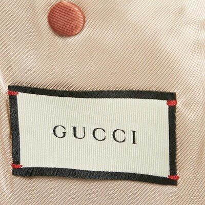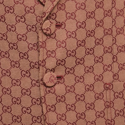 This Gucci blazer is woven in jacquard with the house’s signature Guccissima motif, turning classic tailoring into a patterned statement. The button front cut preserves its formal structure, while the textured surface brings rhythm and depth.
