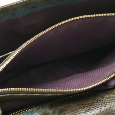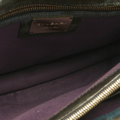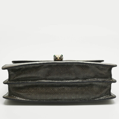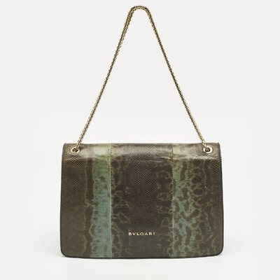 Bvlgari’s Serpenti Forever shoulder bag takes form in green and black karung leather, its surface rich with natural texture. At the flap, the clasp becomes both closure and ornament, a signature detail of the house. Carried by the chain strap, it moves easily from day into evening.