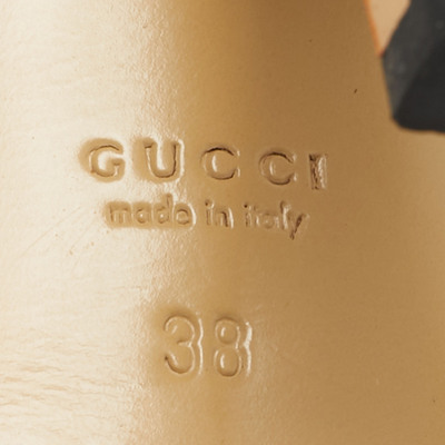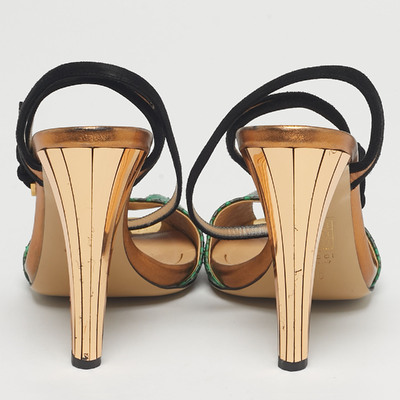 These Gucci pumps combine exotic green python leather with soft suede for a striking textured finish. The elegant ankle wrap and peep toe silhouette add a daring yet refined touch. A luxurious choice for statement dressing.