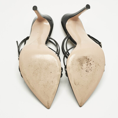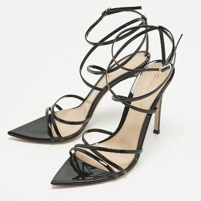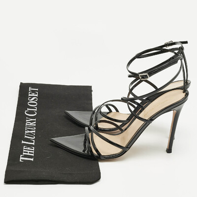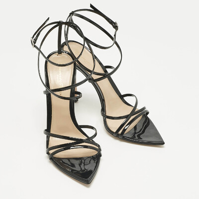 These Kim sandals from Gianvito Rossi are cut in black patent leather and secured with slim ankle straps. Their sharp lines and stiletto heel reflect the brand’s signature focus on clean, confident design.