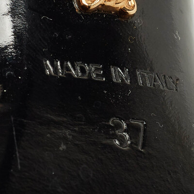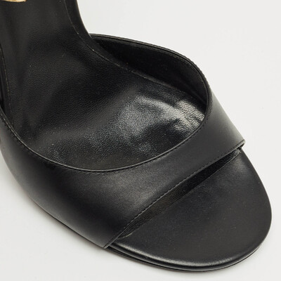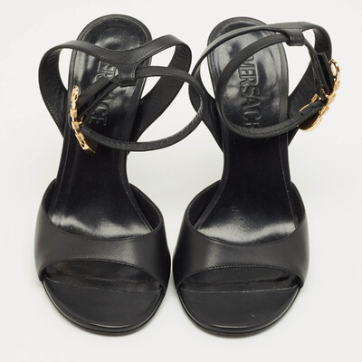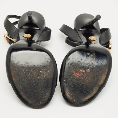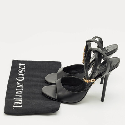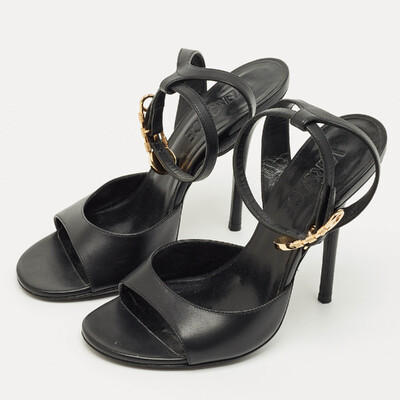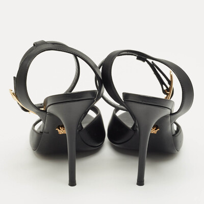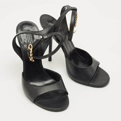 A tribute to Versace’s daring spirit, these black leather sandals feature the iconic safety pin hardware for a bold edge. The sleek ankle strap adds structure while keeping the silhouette effortlessly chic. Perfect for elevating night out ensembles with signature glamour.