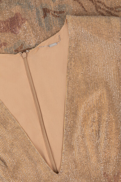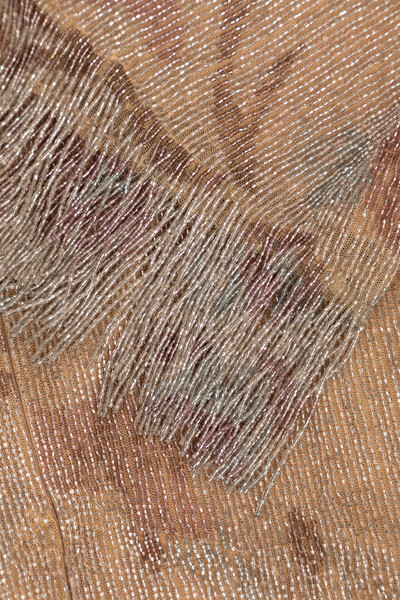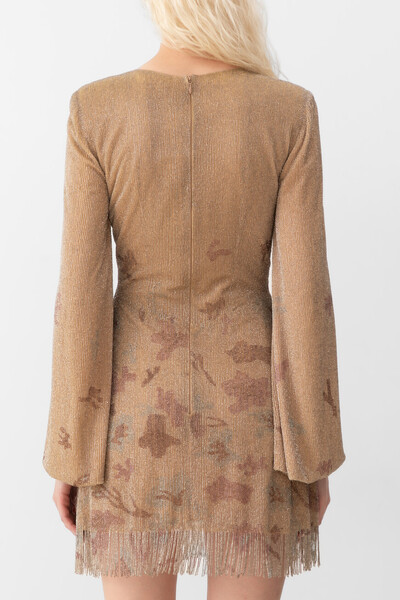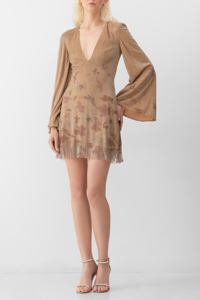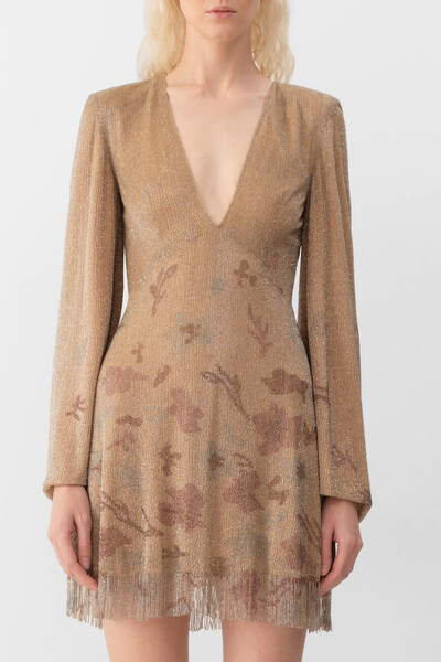 Прилегающее платье выше колена от бренда YANA. Модель с глубоким V-образным вырезом декольте изготовлена из сетчатого шелкового полотна бежевого оттенка, расшитого переливающимся на солнце бисером. В роли декора также выступают нежный цветочный мотив и бахрома из бисера по нижнему краю. Изделие ручной работы застёгивается потайной молнией в задней части и сочетается с высокими босоножками бренда.