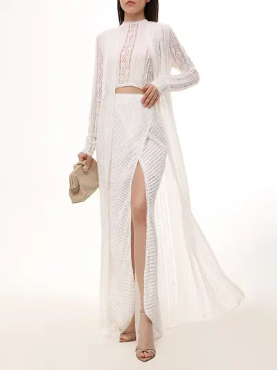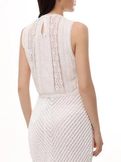 -Модель полуприлегающего кроя с круглым вырезом горловины, каплевидным вырезом и застежкой на пуговицу на спинке, кружевными вставками.