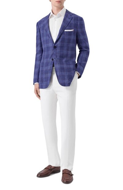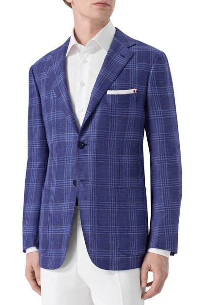 Для пошива пиджака в крупную клетку потребовалось не менее 22 часов ручной работы. Модель с тремя внешними карманами выполнили из кашемира, шелка и льна. В комплекте – платок с фирменной вышитой алой точкой.