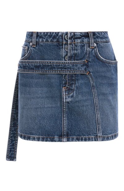 Выбеленную джинсовую юбку с застежкой button fly и фирменным жакроном украсили вышитым узором на двух из пяти карманах. Модель из хлопкового денима дополнили широким ремешком, фиксирующимся брендированным болтом сбоку.