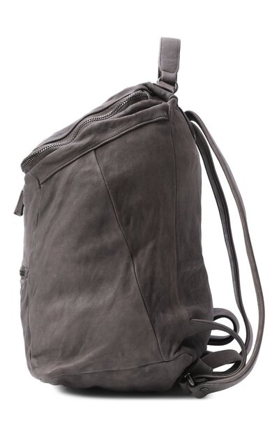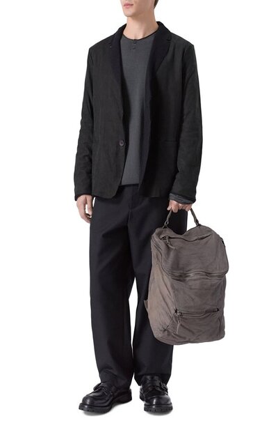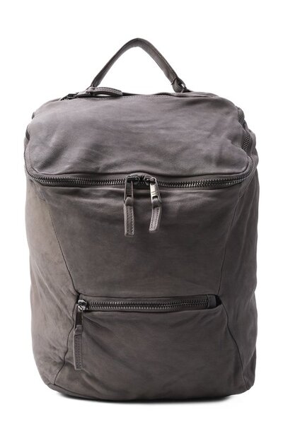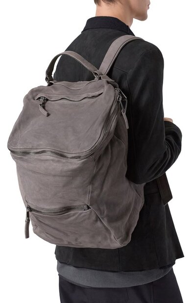 Рюкзак с короткой ручкой и регулируемыми лямками выполнили из мятой кожи ягненка растительного дубления. Аксессуар с двумя внешними карманами на молнии дополнили еще парой внутренних.