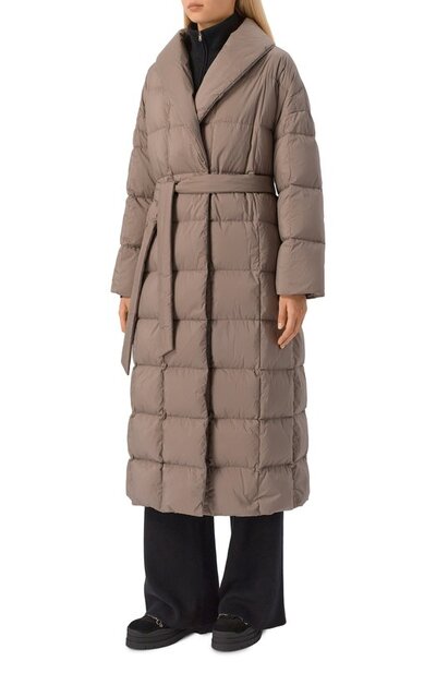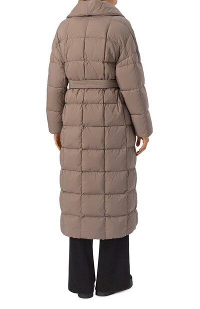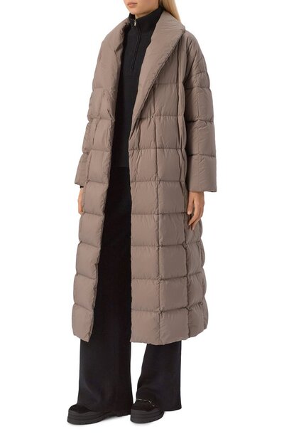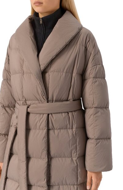 Для пошива стеганого пальто на гусином пуху использовали влагостойкий непродуваемый полиамид. Модель с шалевым воротником и боковыми карманами, застегивающуюся кнопкой, дополнили поясом-лентой.