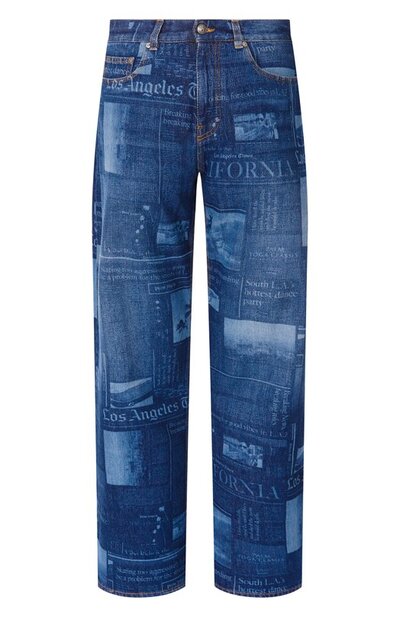 Джинсы с пятью карманами выполнили из хлопкового денима с брендированным паттерном Newspaper. Пояс модели кроя Loose fit украсили сзади патчем с логотипом марки.