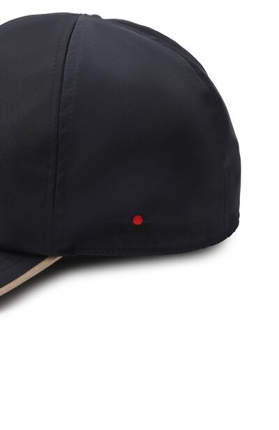 Бейсболку с контрастным кантом на козырьке выполнили из матового нейлона. Посадка головного убора регулируется ремешком с застежкой велкро. На принадлежность аксессуара марке указывает вышитый логотип.