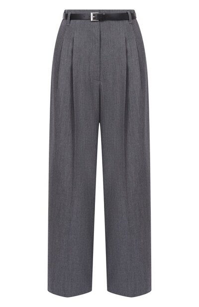 Широкие брюки со стрелками выполнили из костюмной шерсти, заложив под передними шлевками двойные защипы. Модель с карманами по бокам дополнили поясом.