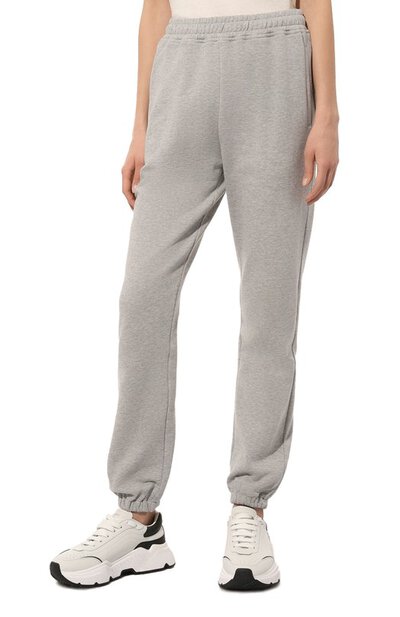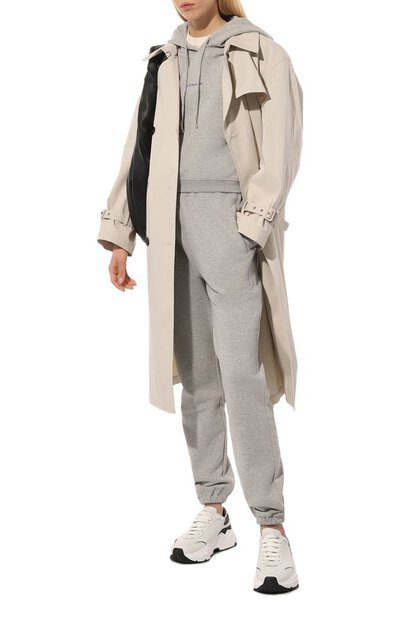 Светло-серые эластичные джоггеры с двумя врезными карманами, широким поясом и классической посадкой сшиты из меланжевого хлопкового футера. Гипоаллергенный мягкий материал с фактурной изнанкой отлично пропускает воздух, а одежда из него не пилингуется со временем. Предлагаем создать образ с худи в тон, бежевым тренчем и белыми кроссовками.