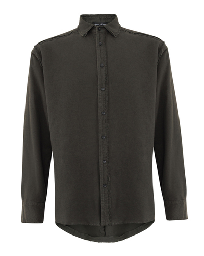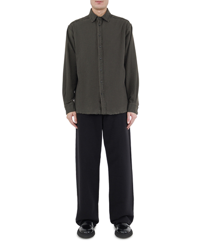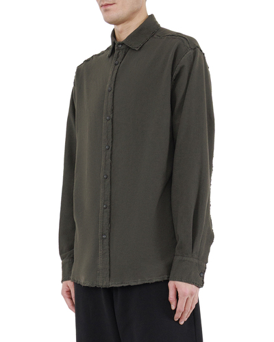 Эта рубашка — выражение непринужденной элегантности с элементами утилитарного шика. Выполненная в глубоком оливково-коричневом оттенке, она добавит вашему гардеробу землистую изысканность, акцентируя внимание на естественной цветовой гамме. Материал изделия отличается мягкостью и легкостью, обеспечивая комфорт и свободу движений. Классический отложной воротник добавляет рубашке структурированность, создавая изысканный акцент. Уникальной особенностью данной модели являются сырые, слегка необработанные края, придающие ей легкий брутальный оттенок и современную эстетику. Это смелое дизайнерское решение сочетается с традиционной пуговичной планкой, создавая контраст между классикой и инновацией. Манжеты с пуговицами позволяют регулировать длину рукава, добавляя элементы практичности. Округленный подол позволяет носить рубашку как навыпуск, так и заправленной, предлагая множество стилистических вариаций. Эта рубашка идеально подходит для создания расслабленных, но стильных образов, подчеркивающих индивидуальность и чувство стиля.